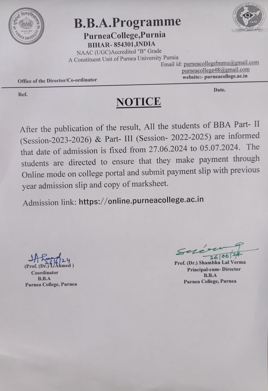 NOTICE REGARDING BBA ADMISSION PART III (2022-25) & PART II (2023-26)